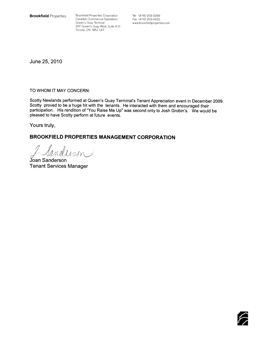 "...Scotty Newlands performed at Queen's Quay Terminal's Tenant Appreciation event in December 2009. Scotty proved to be a huge hit with the tenants. He interacted with them and encouraged their participation. His rendition of "You Raise Me Up" was second only to Josh Grobin's. We would be pleased to have Scotty perform at future events...